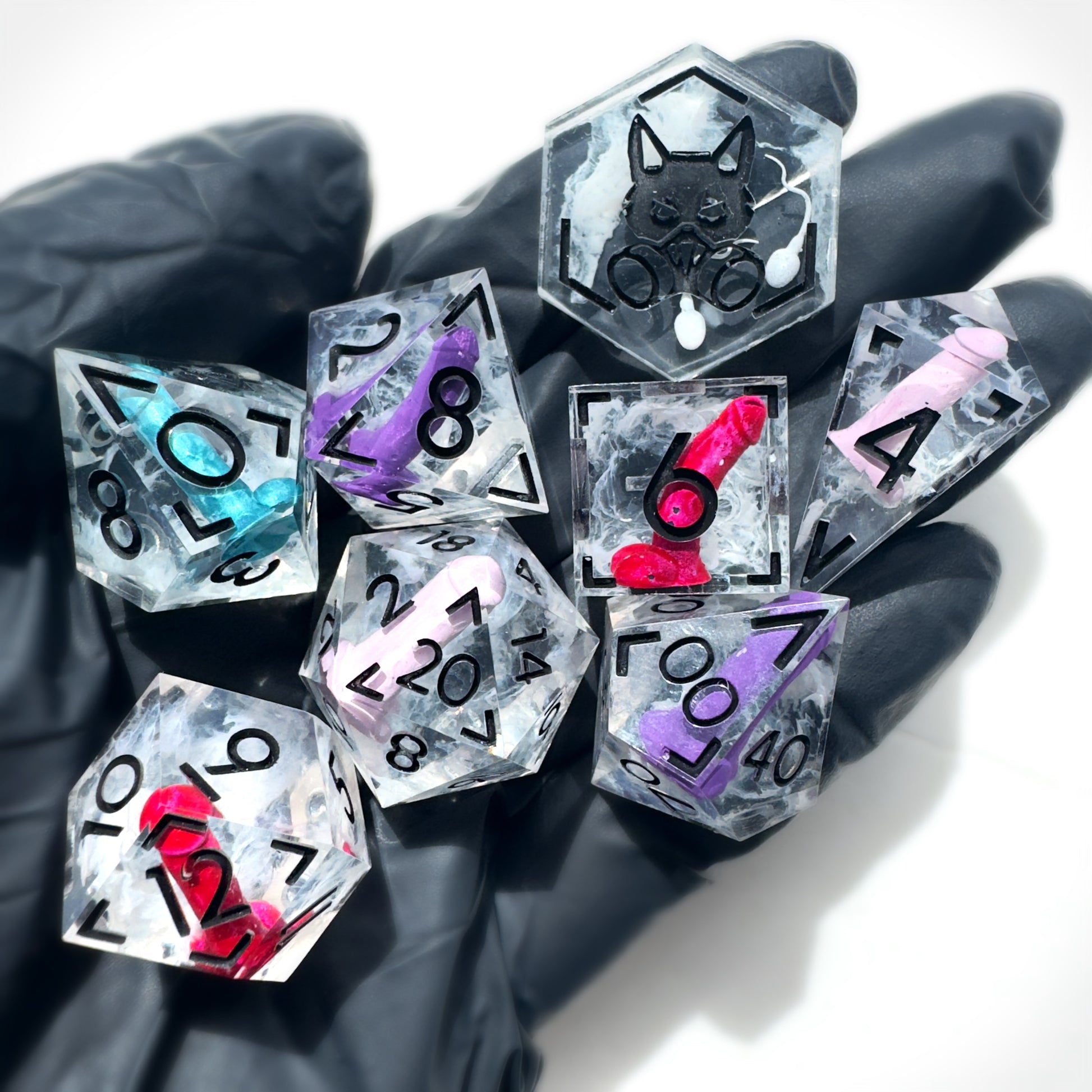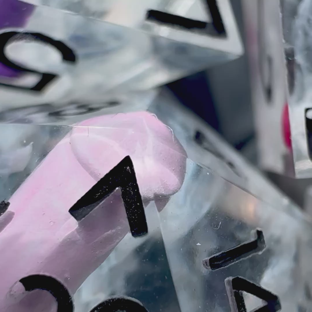 An 8pc resin dice set featuring hand-painted "disco sticks” and swimmers, with wisps of white resin, inked in Vanta black acrylic paint.