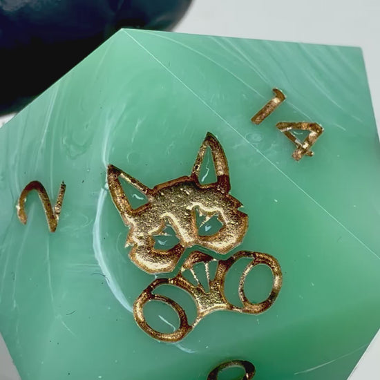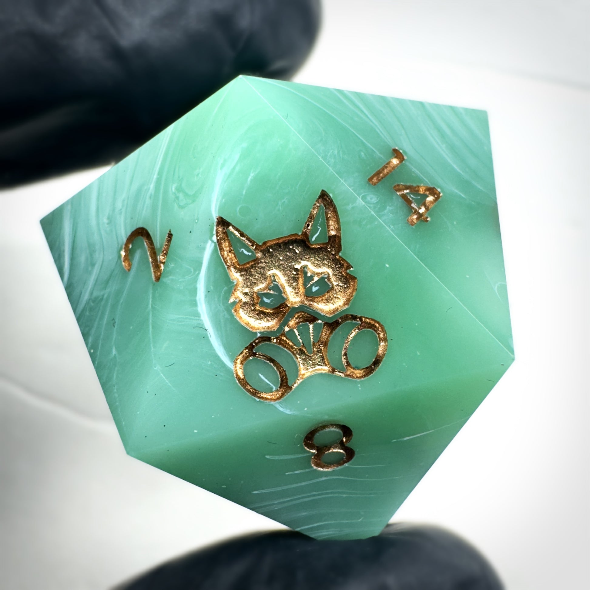 A 35mm chonk d20 with marbled jade, Inked in metallic gold.